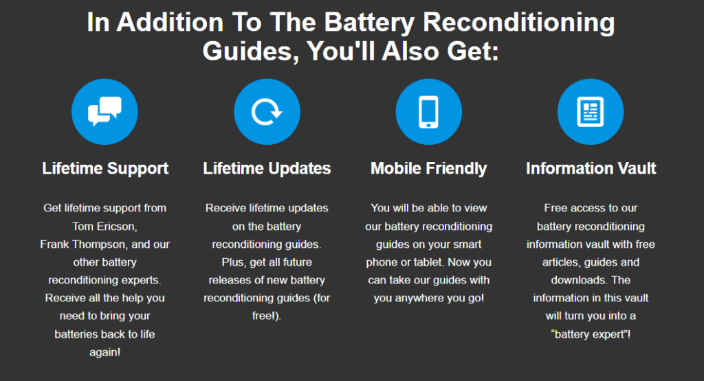 The course is made up of step-by-step guides that show you how to recondition each type of battery. And each guide is full of pictures and diagrams so you not only read exactly what to do …you see exactly what to do as well!